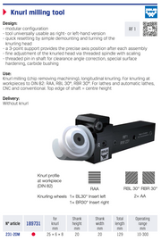 Το εργαλείο ραουλοχάραξης με φρεζάρισμα RF1 προορίζεται για διαμήκη κατεργασία με απομάκρυνση υλικού. Είναι κατάλληλο για προφίλ RAA, RBL 30° και RBR 30° σύμφωνα με DIN 82. Υποστηρίζει δεξιά και αριστερή χρήση και διαθέτει υποστήριξη 3 σημείων για ακριβή τοποθέτηση, σύστημα λεπτής ρύθμισης και αυξημένη αντοχή μέσω καρβιδικής επένδυσης. Κατάλληλο για τόρνους CNC και συμβατικούς.