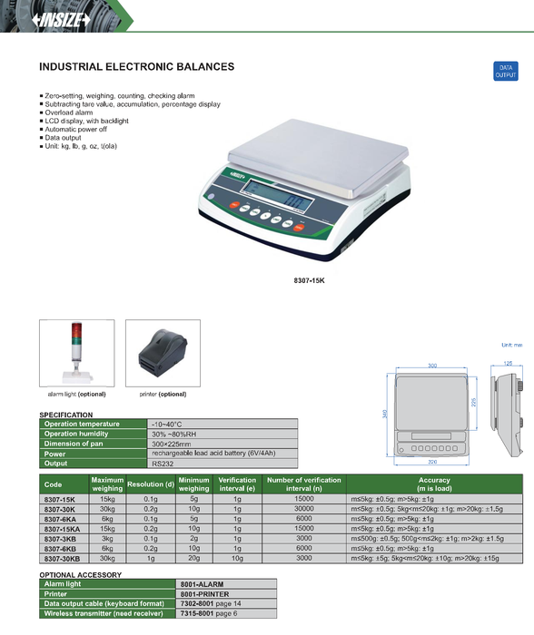 Ηλεκτρονικοί ζυγοί βιομηχανικής χρήσης με δυνατότητα ζύγισης έως 30kg, διαθέτουν οθόνη LCD με οπίσθιο φωτισμό και διάφορες λειτουργίες όπως απόβαρο, καταμέτρηση, συναγερμούς και έξοδο RS232. Κατάλληλες για χρήση σε περιβάλλοντα με υψηλή ακρίβεια και έλεγχο διαδικασιών.