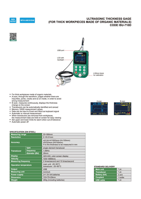 Το παχύμετρο υπερήχων ISU-710D είναι σχεδιασμένο για τη μέτρηση παχιών τεμαχίων από οργανικά υλικά. Υποστηρίζει A-scan και B-scan απεικόνιση για την ανάλυση της δομής του υλικού και τον εντοπισμό ατελειών. Με εύρος μέτρησης έως 590mm και αισθητήρα χαμηλής συχνότητας (1.0MHz), είναι κατάλληλος για εφαρμογές που απαιτούν ακριβή έλεγχο μεγάλου πάχους.