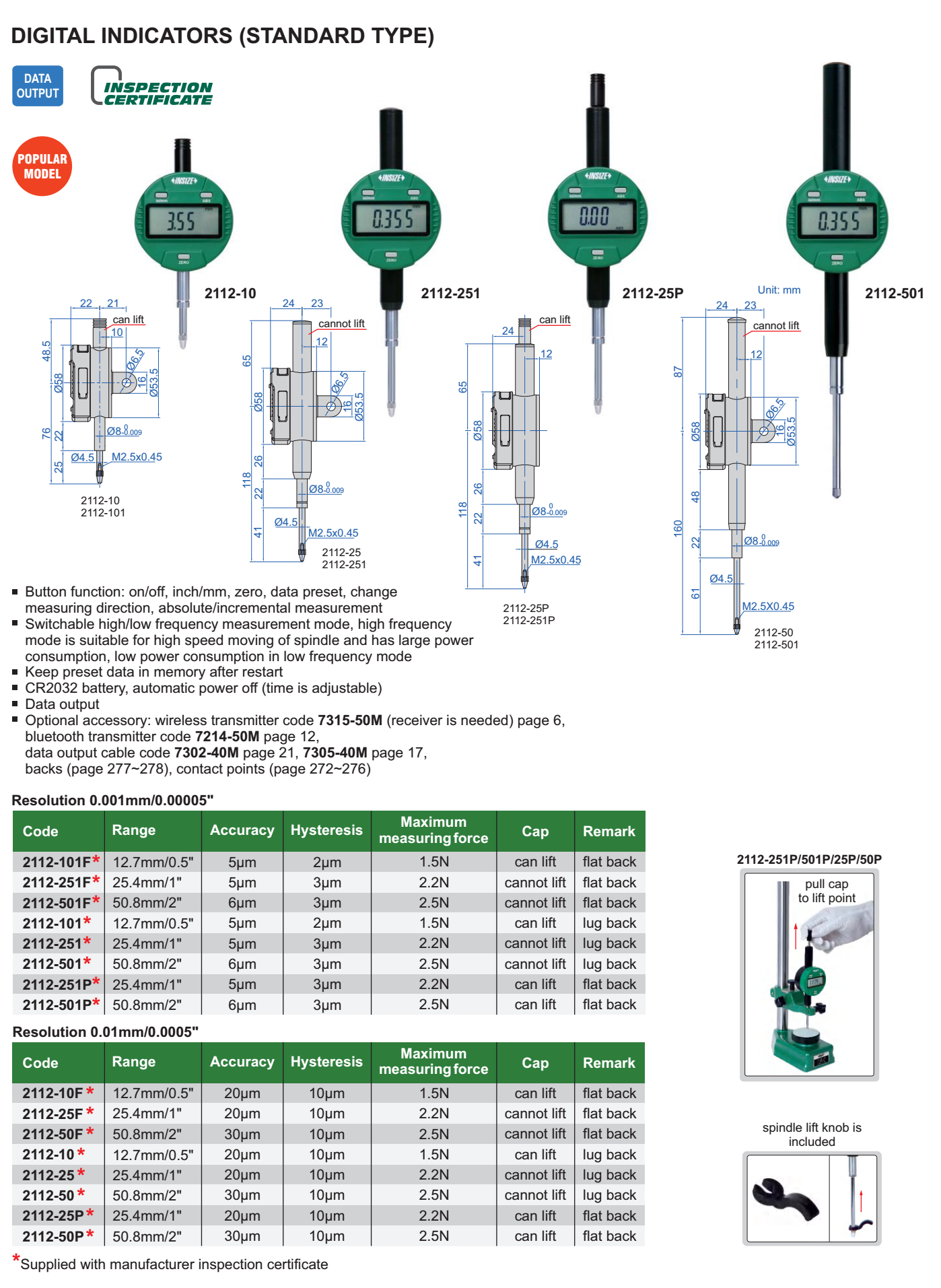| 2112-501P | 0-50 mm | 0.001 mm | straight with lift cap | 5-8 business days |