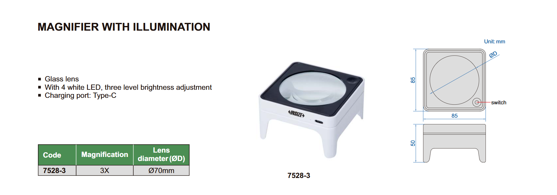 Insize desktop magnifying glass, suitable for detailed tasks such as reading miniatures, sewing, electronic assembly, and reading small texts. Built-in light provides uniform illumination. Rechargeable via USB-C port and easy to carry due to lightweight ABS plastic frame.