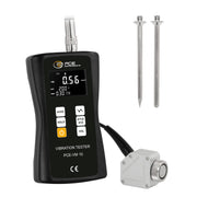 The 3-Axis Vibration Recorder has a 3-axis piezoelectric accelerometer with three mounting options: a magnetic sensor and two measuring tips (one conical and one spherical) that can be attached to the sensor. These accessories enable precise and versatile vibration measurements on various machines and surfaces. This makes the device a handy and powerful tool for industrial vibration measurements. It supports various units such as mm/s, inch/s, m/s², g, ft/s², mm and mil and has a measurement function that displays the maximum measured values.