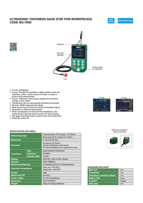 Το ISU-700D είναι ένα παχύμετρο υπερήχων σχεδιασμένο για λεπτά τεμάχια. Διαθέτει λειτουργία σάρωσης (A/B Scan) για την ανίχνευση ατελειών, όπως πόροι και ρωγμές. Επιτρέπει αυτόματη ή χειροκίνητη μέτρηση, αποθήκευση έως 10.000 τιμών και σύνδεση δεδομένων μέσω USB. Προσφέρει υψηλή ακρίβεια και δυνατότητα ρύθμισης ορίων συναγερμού.