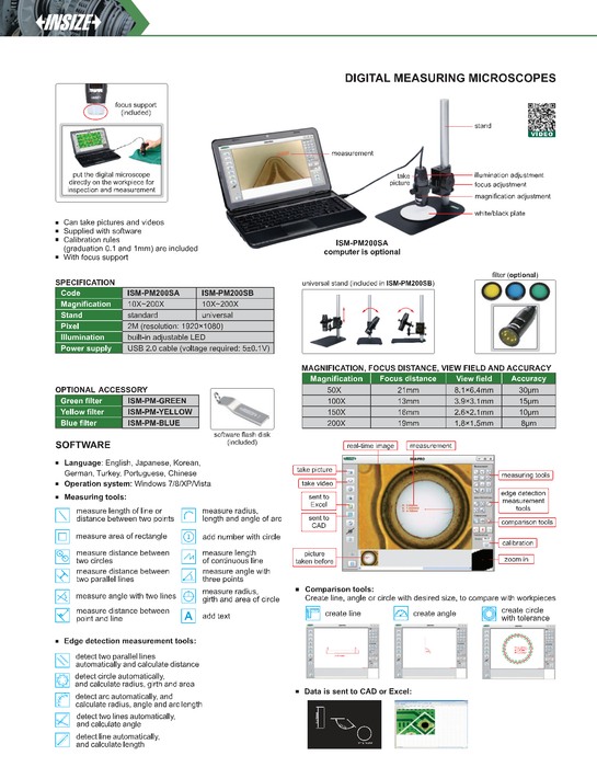 Ψηφιακό μικροσκόπιοι μέτρησης με δυνατότητα λήψης φωτογραφιών και βίντεο, σχεδιασμένα για ακριβείς επιθεωρήσεις και μετρήσεις σε μικροσκοπικό επίπεδο. Διαθέτουν κάμερα υψηλής ανάλυσης, ενσωματωμένο φωτισμό και εξειδικευμένο λογισμικό για μέτρηση διαστάσεων, γωνιών, κύκλων και τόξων. Τα δεδομένα μπορούν να εξαχθούν σε Excel ή CAD για περαιτέρω επεξεργασία. Περιλαμβάνεται υποστήριγμα εστίασης και βάση (τυπικό ή universal).
